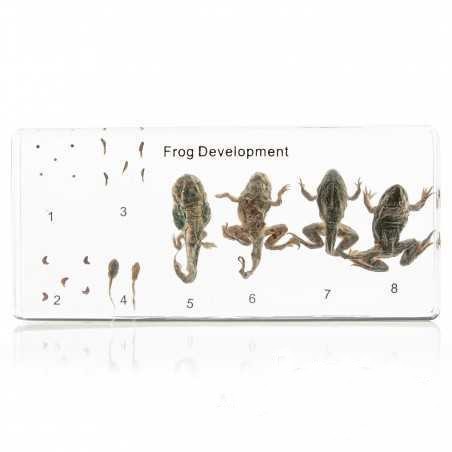Přírodní exempláře znázorňující vývojová stadia žáby od vajíčka, přes pulce až po žábu