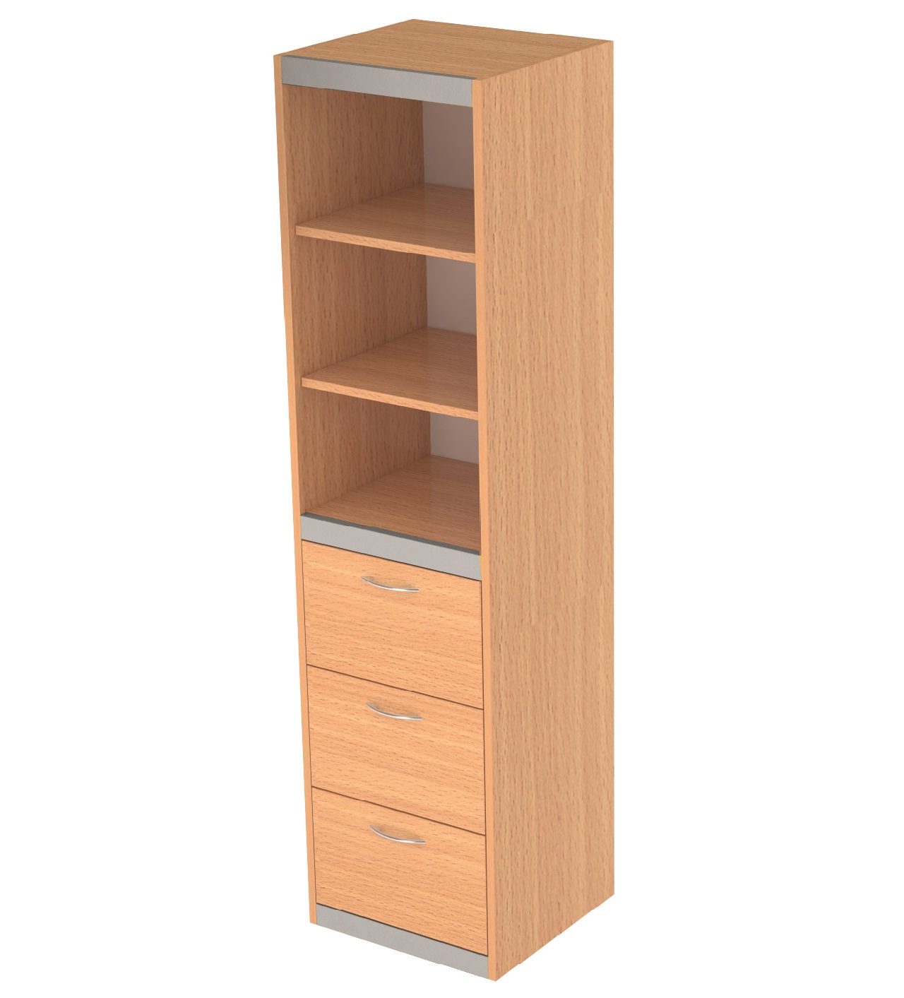 Skříň má ve spodní uzavřené části tři zásuvky a v horní otevřené části dvě přestavitelné police.