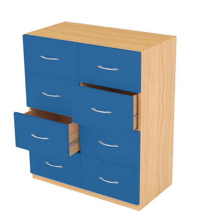 Korpusy celodřevěných skříní jsou vyráběny z materiálu LDT s ABS hranou v bukovém odstínu s možností výběru různě barevných kombinací dveří dle nabídky.