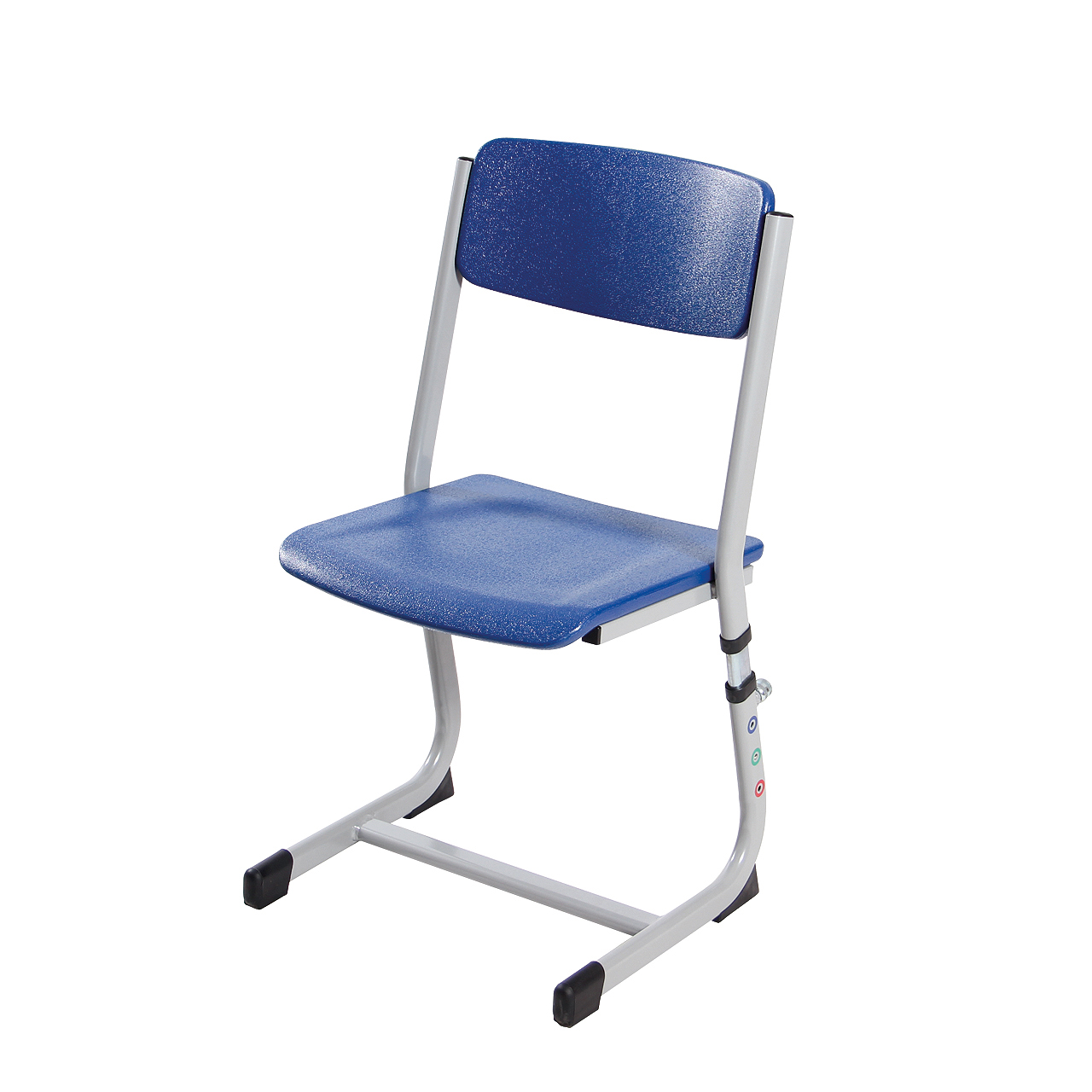 Jedná se o praktickou VÝŠKOVĚ STAVITELNOU školní židli s kovovou plochoválnou podnoží ve tvaru C a PLASTOVÝM sedákem a opěrákem.