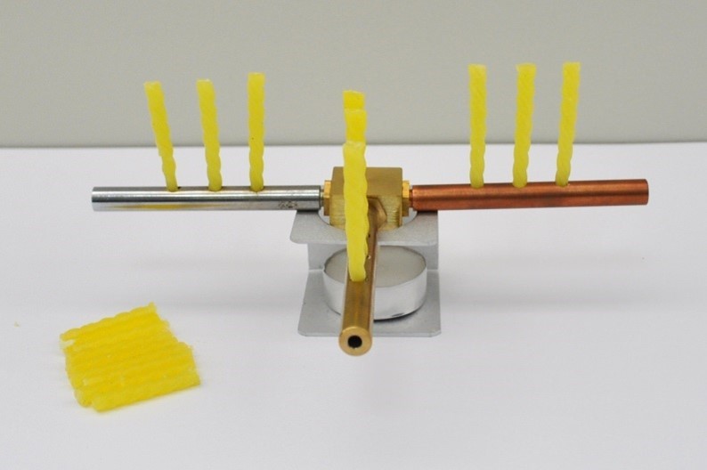 - Tepelný vodič (se třemi kovovými tyčemi: měď, mosaz a ocel)