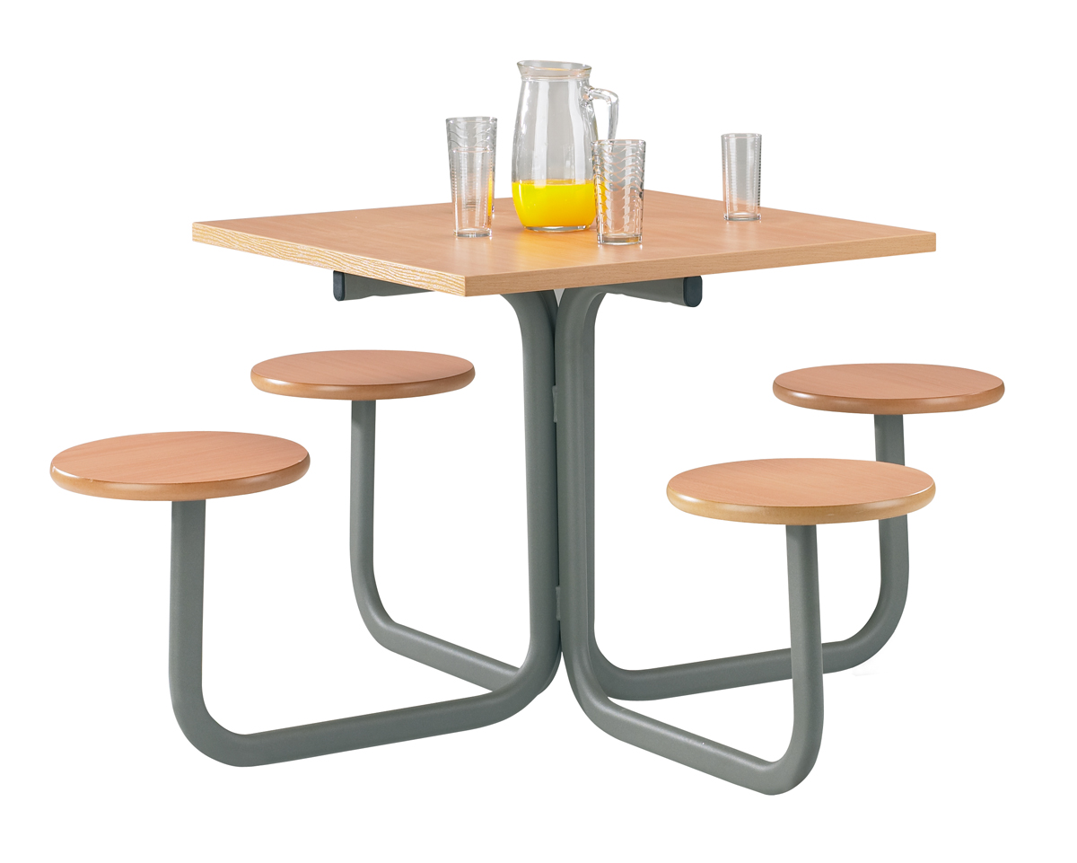 Jídelní stůl o rozměru 76 x 80 x 80 cm s pevnými kulatámi dřevěnými sedáky a kotvením do podlahy.