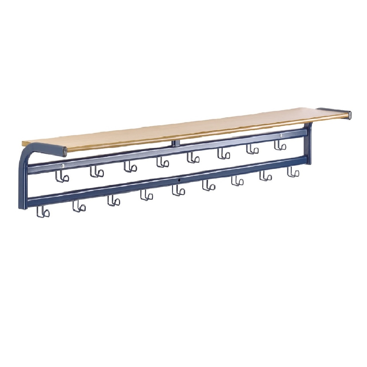 Věšák s horní odkládací policí o rozměru 155 cm s 17 drátěnými háčky.